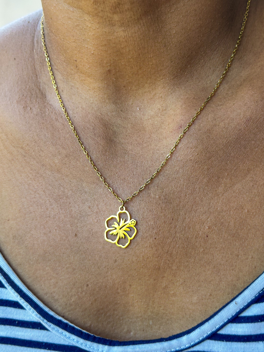 Son pendentif en forme de fleur d’hibiscus évoque la douceur des tropiques, l’élégance naturelle et ce petit supplément d’âme qu’on adore glisser dans une tenue.