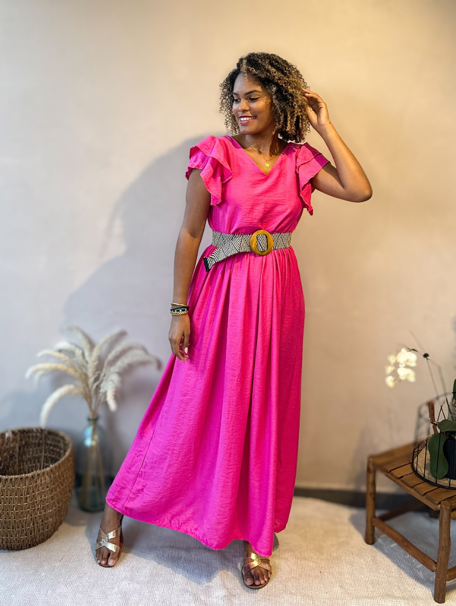 Fluide et élégante, la robe Amarea séduit par sa coupe longue aérienne et son allure bohème. Ses manches à volants apportent une touche romantique tandis que le dos boutonné révèle un détail raffiné qui attire les regards. Légère et confortable, elle accompagne chaque mouvement avec grâce.