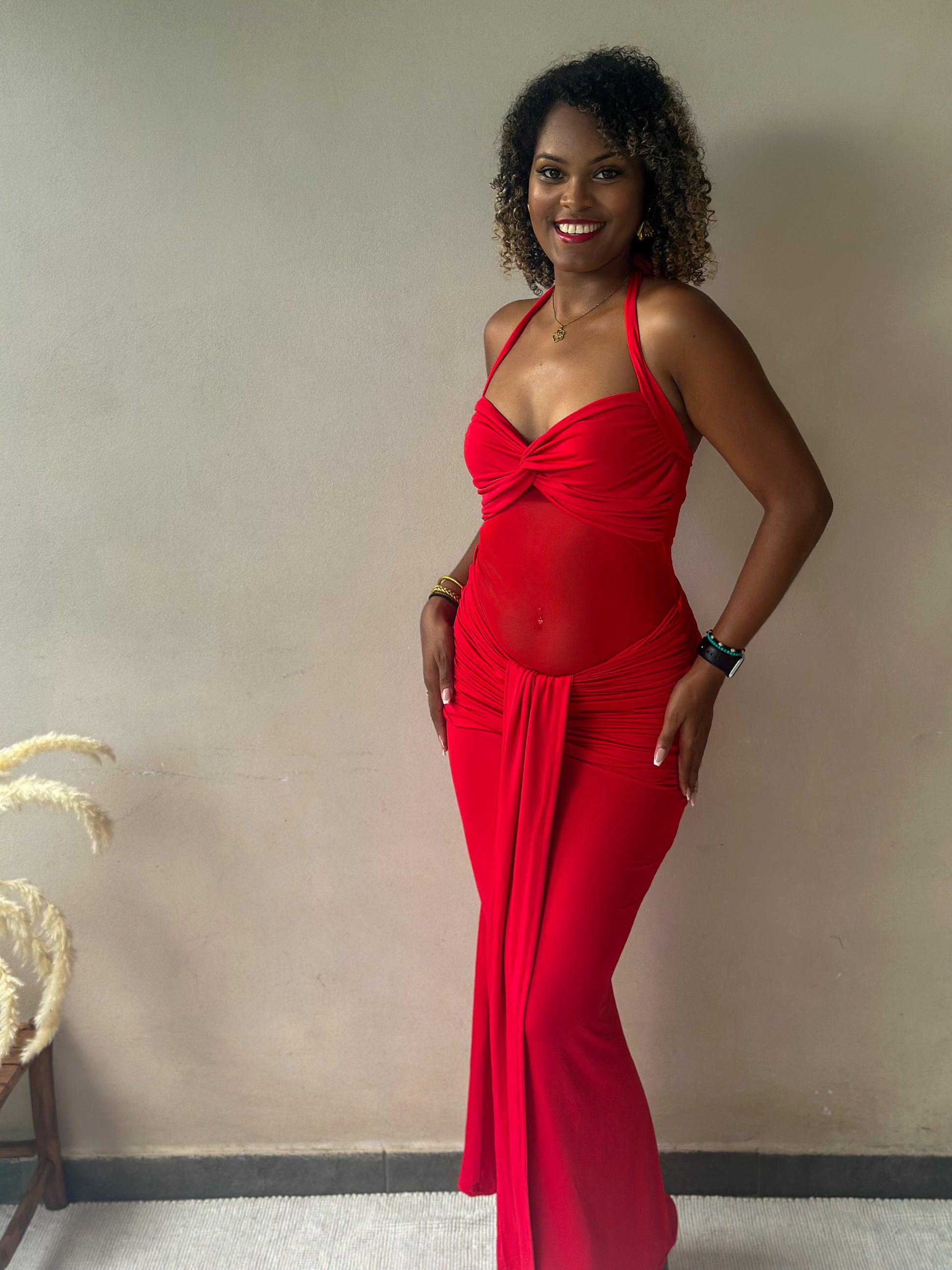 Cette robe rouge longue révèle juste ce qu’il faut : un jeu de transparence subtil au niveau du ventre et du dos, parfaitement dosé pour sublimer la silhouette sans jamais en faire trop. Sa coupe fluide et élégante allonge la ligne du corps, tandis que son attache au cou apporte une touche moderne et chic.