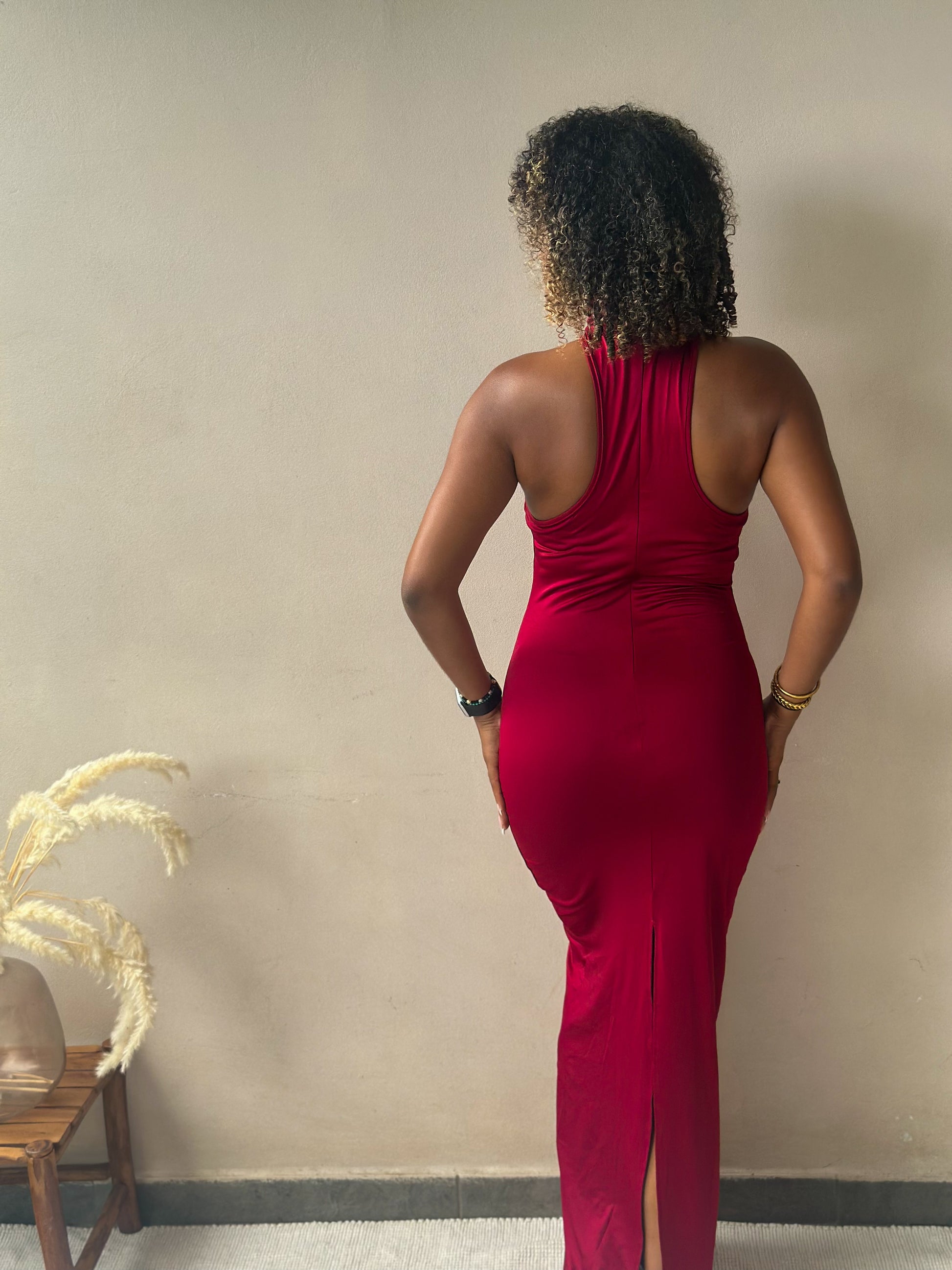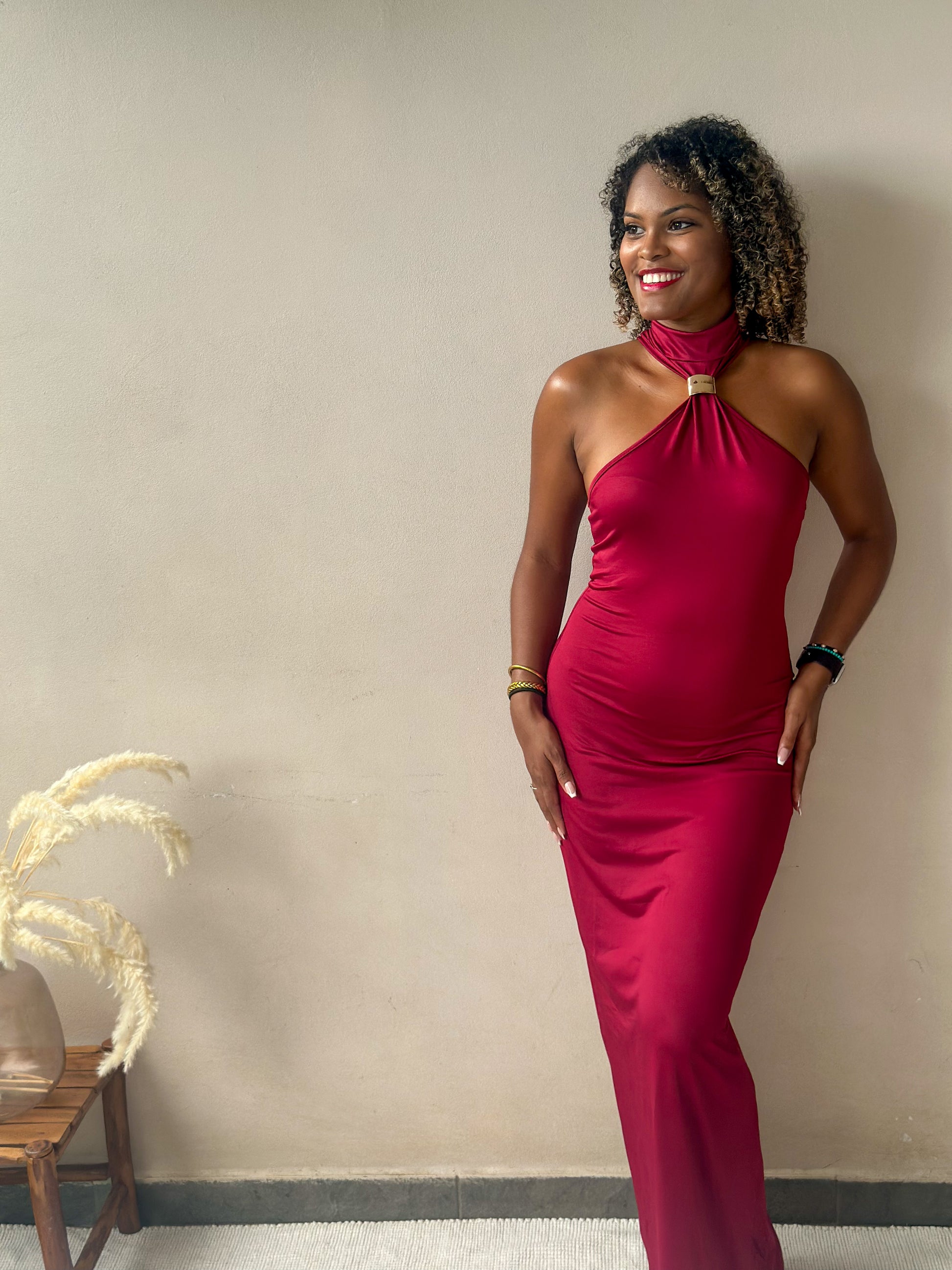 Sculptante, élégante et indéniablement féminine, cette robe longue dans un intense rouge vin dessine une silhouette fluide et raffinée.